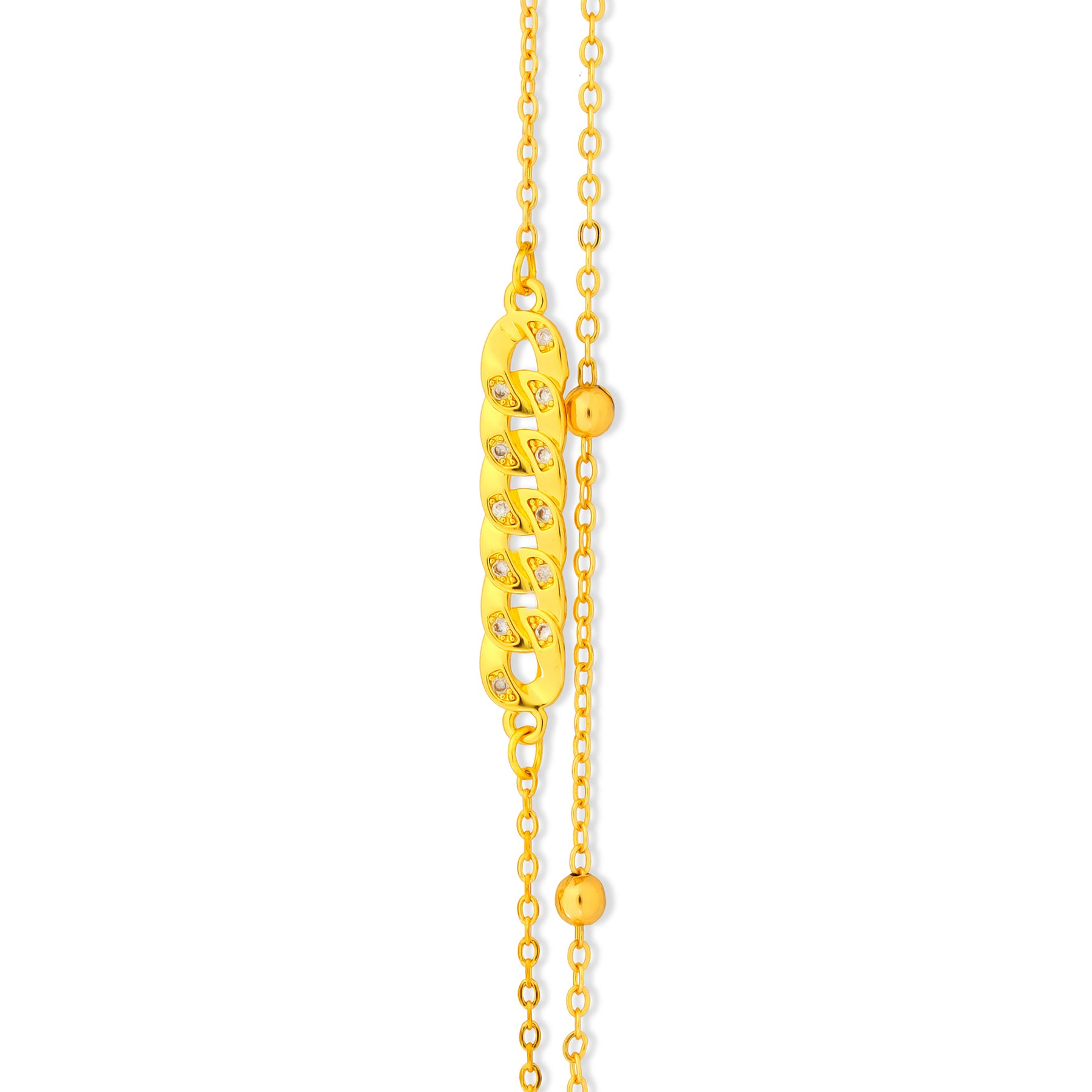 Celene Cuban Link pairs a slim double chain with a pavé Cuban-style connector that adds clean sparkle without going over the top. It sits neatly on the wrist and works with everything from simple tees to dressier fits.