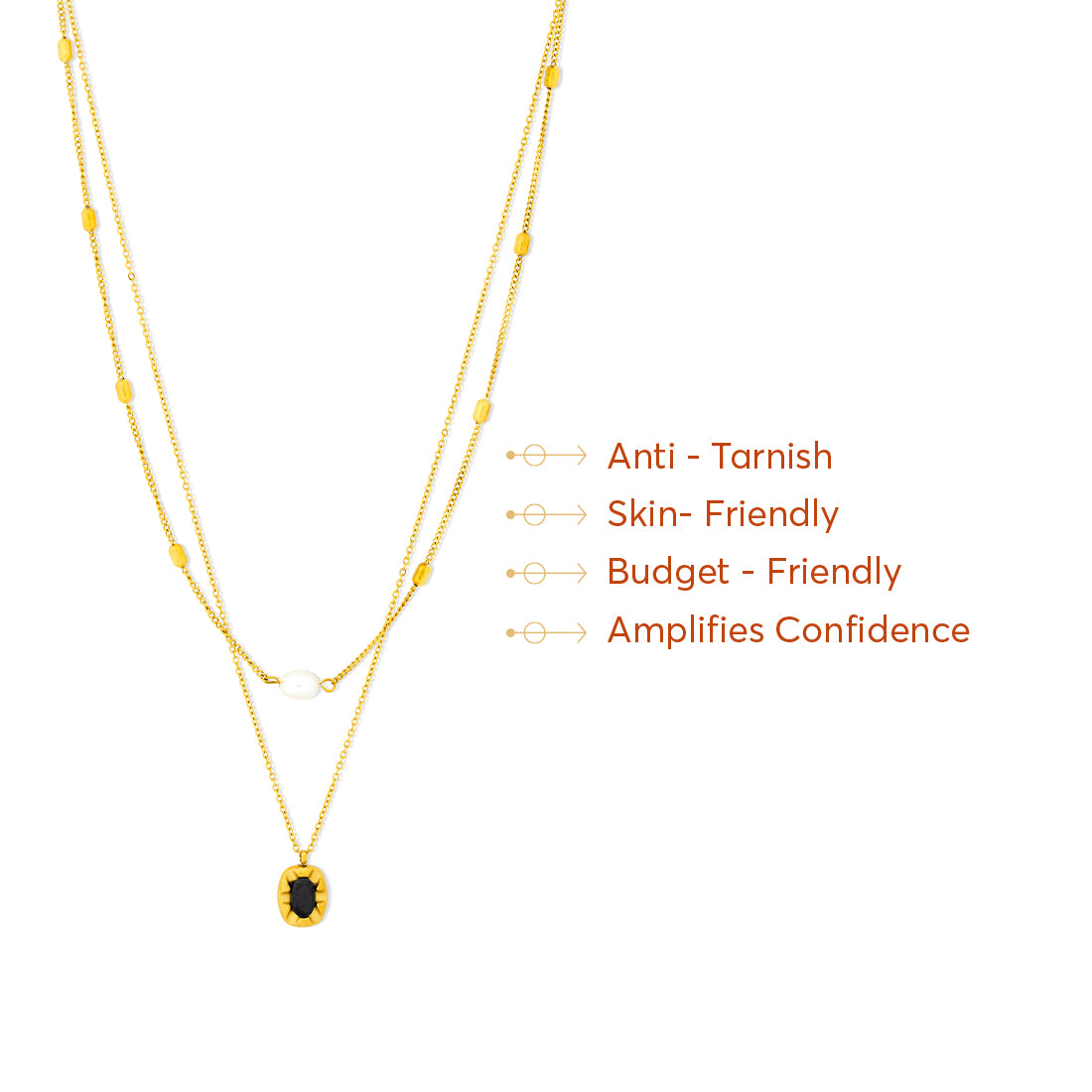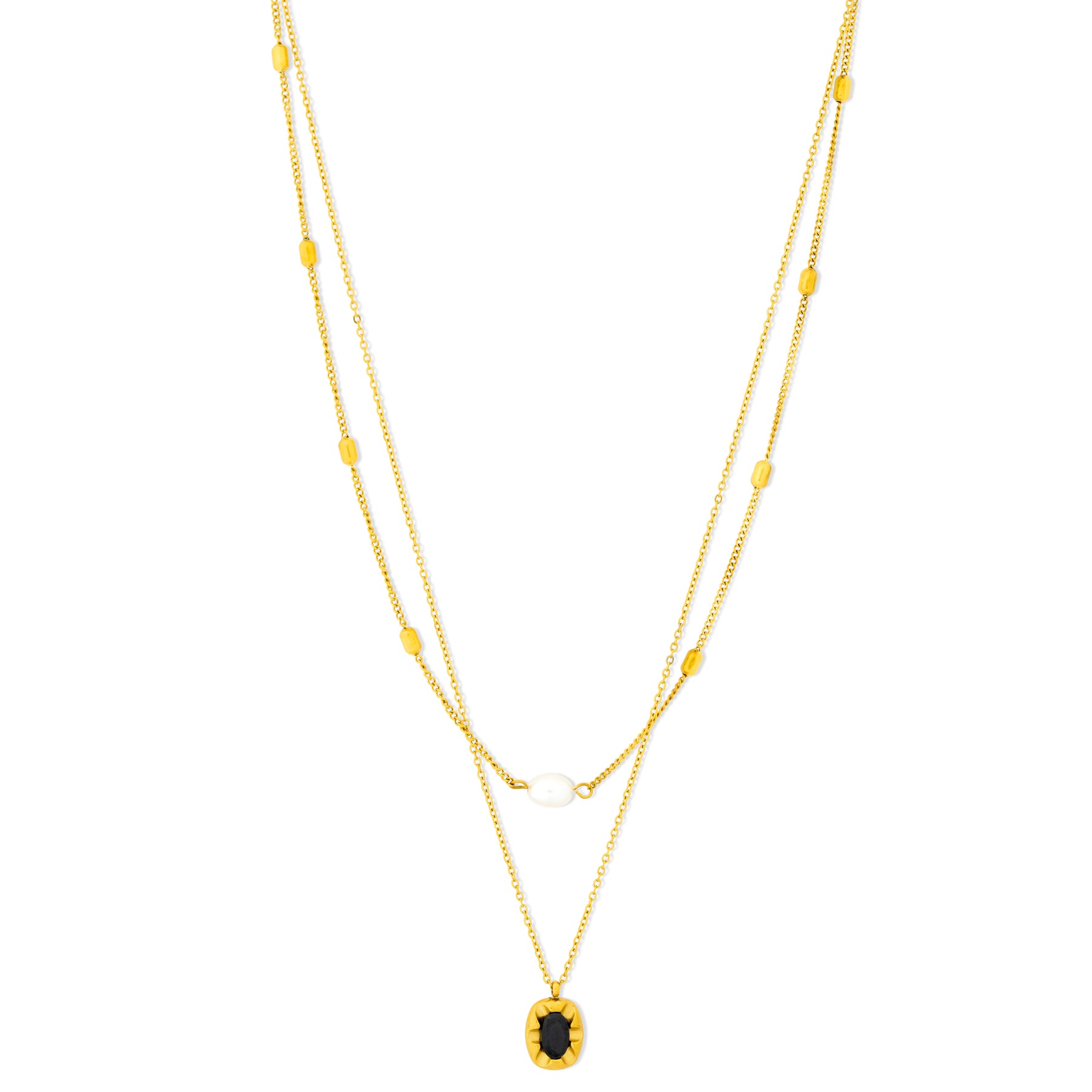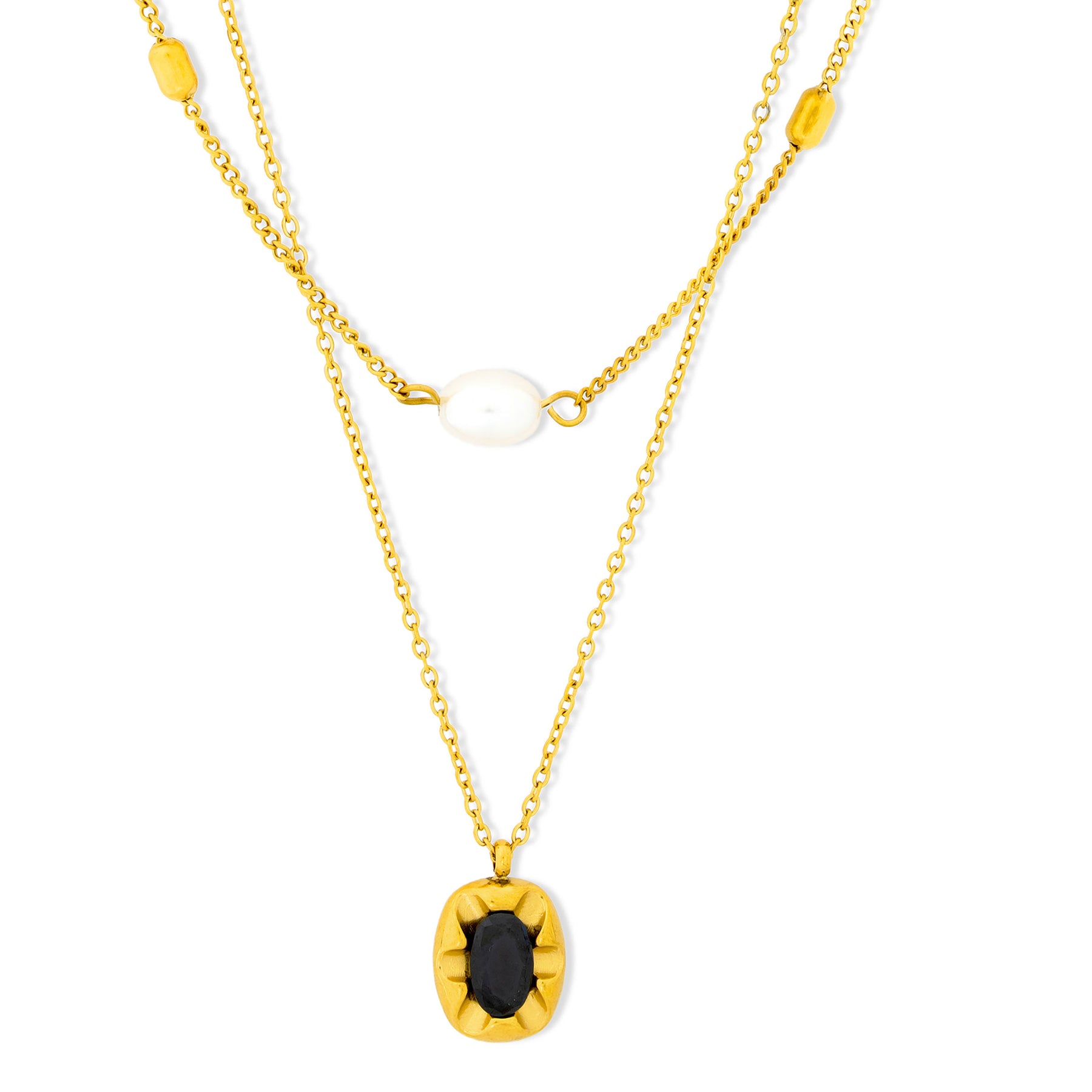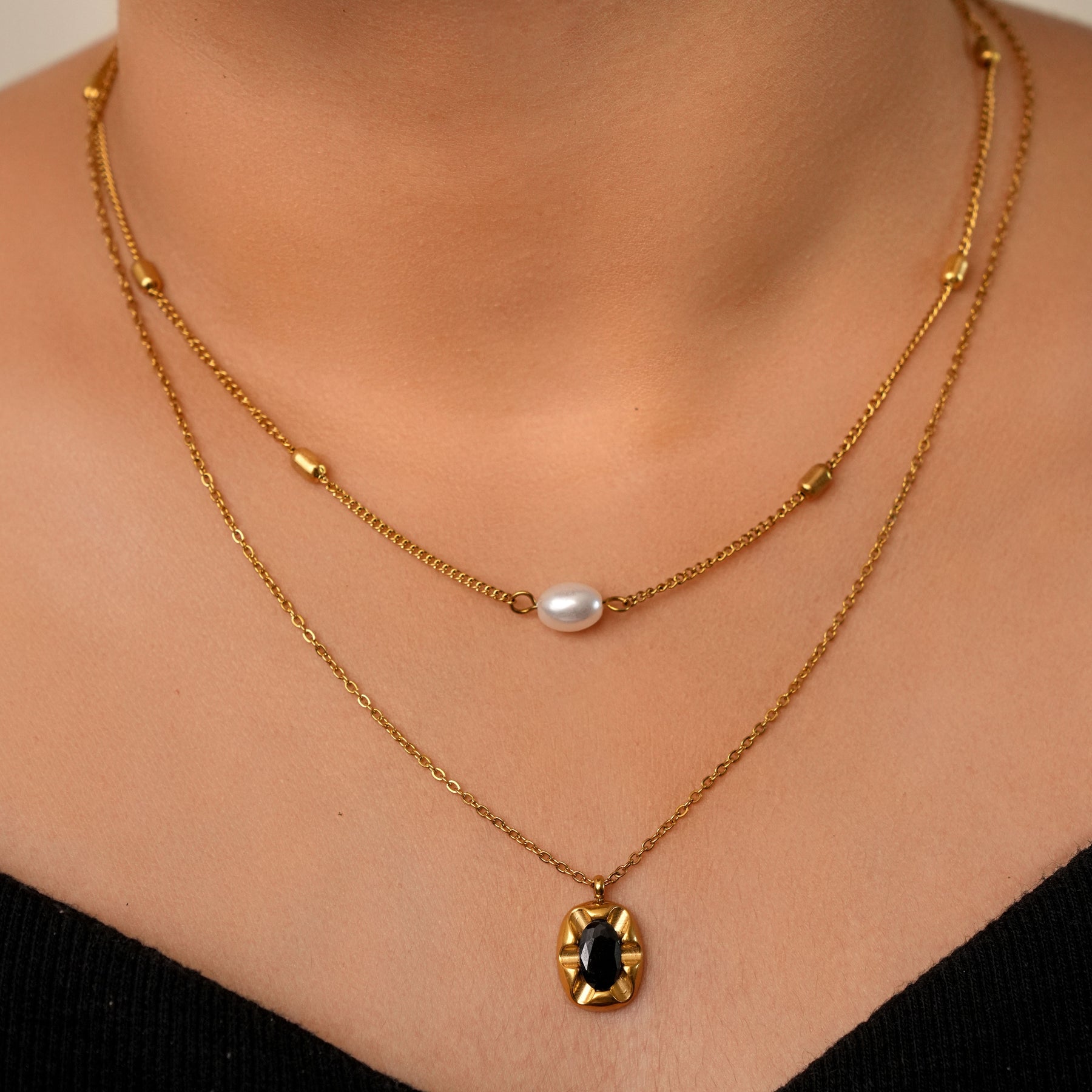 Orbit Contrast centres a deep stone inside a warm gold frame, giving the pendant a clear focal point. The shape sits neatly on the neckline, whether worn alone or paired with lighter chains.